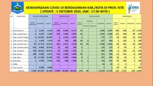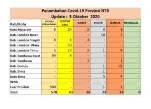 Dalam siaran pers hari Sabtu (03/10/20), Ketua Pelaksana Harian Gugus Tugas NTB, Drs. HL Gita Ariadi, M.Si menjelaskan, telah diperiksa sebanyak 167 sampel dengan hasil 139 sampel negatif, 5 (lima) sampel positif ulangan, dan 23 sampel kasus baru positif Covid-19, pasien sembuh 33 orang, tidak ada kasus kematian