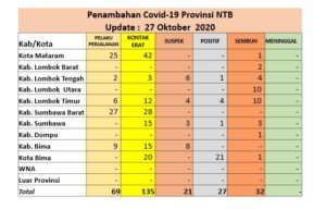 Dalam siaran pers hari Kamis (29/10/20), Ketua Pelaksana Harian Gugus Tugas NTB, Drs. HL Gita Ariadi, M.Si menjelaskan, telah diperiksa sebanyak 68 sampel dengan hasil 52 sampel negatif, tidak ada sampel positif ulangan, dan 16 sampel kasus baru positif Covid-19, pasien sembuh 4 (empat) orang, tidak ada kasus kematian.