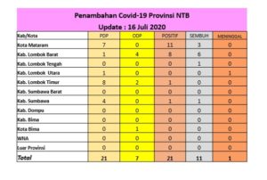Dijelaskan,  adanya tambahan 21 kasus baru terkonfirmasi positif, 11 tambahan sembuh baru, dan 1 (satu) kasus kematian baru, maka jumlah pasien positif Covid-19 di Provinsi NTB sampai hari ini (16/7/2020) sebanyak 1.669 orang, dengan perincian 1.065 orang sudah sembuh, 86 meninggal dunia, serta 518 orang masih positif dan dalam keadaan baik.