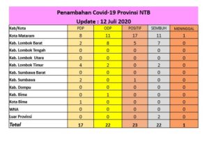 Siaran pers hari Minggu (12/07/20), Ketua Pelaksana Harian Gugus Tugas Provinsi Nusa Tenggara Barat, Drs. HL Gita Ariadi, M.Si menjelaskan, telah diperiksa sebanyak 226 sampel dengan hasil 186 sampel negatif, 17 sampel positif ulangan, dan 23 sampel kasus baru positif Covid-19, pasien sembuh 22 orang, kasus kematian 1 (satu) orang.
