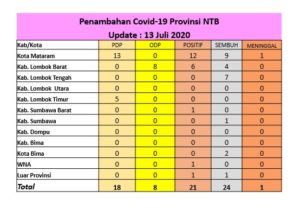 Siaran pers hari Senin (13/07/20), Ketua Pelaksana Harian Gugus Tugas Provinsi Nusa Tenggara Barat, Drs. HL Gita Ariadi, M.Si menjelaskan, telah diperiksa sebanyak 175 sampel dengan hasil 142 sampel negatif, 12 sampel positif ulangan, dan 21 sampel kasus baru positif Covid-19, pasien sembuh 24 orang, kasus kematian 1 (satu) orang.