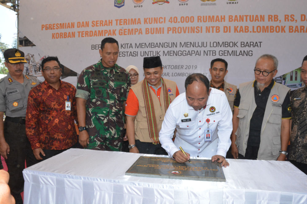 LOMBOK BARAT ; Deputi 1 Kemenko PMK RI Bidang Kerawanan Sosial Dan Dampak Bencana, Mayjen TNI (purn) Dody Usodo Hargo, meresmikan dan menyerahkan 40 ribu unit rumah tahan gempa (RTG) bantuan pemerintah untuk Korban Gempa NTB.