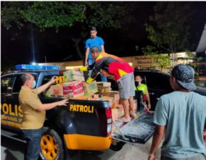 Kapolres Sumbawa, AKBP Widy Saputra mengumpulkan bantuan terpal, makanan dan minuman.. Namun perjalanan malam ini hanya sampai Desa Sebeok, Kecamatan Orong Telu. Mengingat akses darat ke Batu Rotok yang terputus.