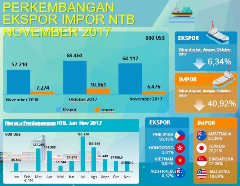 Demikian besaran nilai ekspor dan impor NTB untuk bulan November 2017 yang dirilis Badan Pusat Statistik ( BPS ) NTB yang disampaikan Kabid Satatistik  Distribusi ,Ni Kadek Adi Mandri, Jumat (14/12 ) di Kantor BPS NTB.