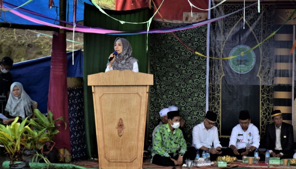Wagub NTB di hadapan jamaah dan masyarakat Desa Sembalun, Kecamatan Sembalun, Kabupaten Lombok Timur pada Pengajian Umum dirangkaikan dengan Peletakan Batu Pertama Pembangunan Ponpes Darul Faizin NWDI, Desa Sembalun, Rabu (16/11/22).
