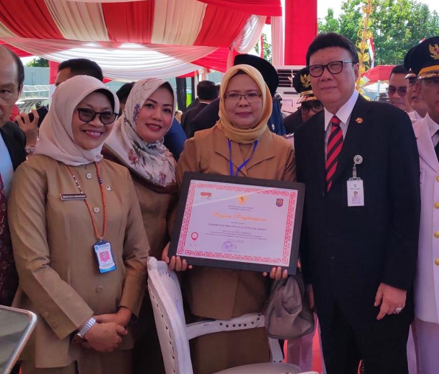 Asisten I Bidang Pemerintahan dan Kesra Setda Provinsi NTB Hj. Baiq Eva Nurcahyaningsih mewakili Gubernur NTB Dr. H. Zulkieflimansyah menerima penghargaan yang diserahkan oleh Menteri Dalam Negeri (Mendagri) RI Tjahjo Kumolo.