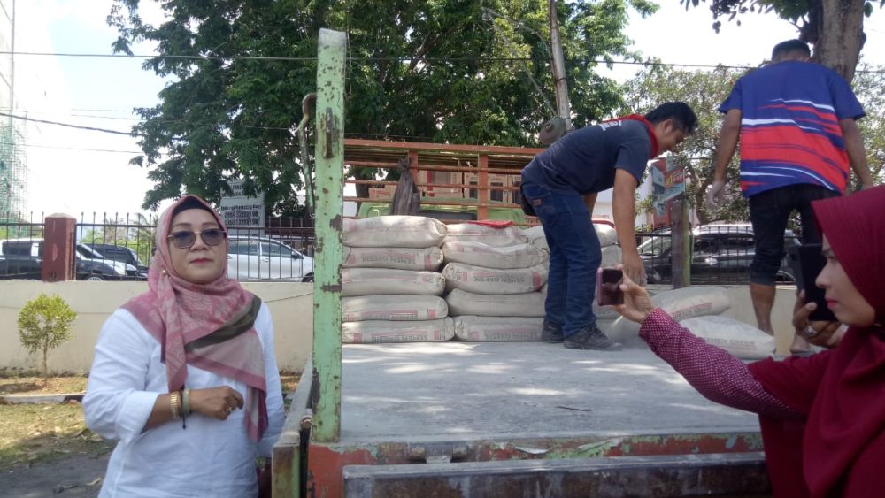 Hj Putu Selly saatmelakukan operasi pasar untuk mengatasi kelangkaan semen yang akan berlangsung selama lima hari ke depan terhitung mulai Selasa (15/10) 2019 (Foto; AYA)