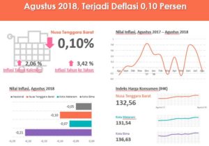 MATARAM.lombokjournal.com — Bulan Agustus 2018, Nusa Tenggara Barat  (NTB) mengalami deflasi sebesar 0,10 persen, atau terjadi penurunan Indeks Harga Konsumen (IHK) dari 132,69 pada bulan Juli 2018 menjadi 132,56 pada bulan Agustus 2018.