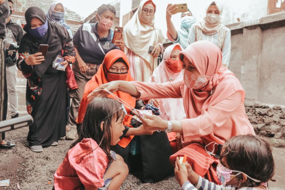 Bunda Niken memasangkan masker pada seorang anak, di tegah kunjungannya di Desa Pringgasela, Kecamatan Pringgasela Kabupaten Lombok Timur, Sabtu (10/10/20). /Foto; HmsNTB
