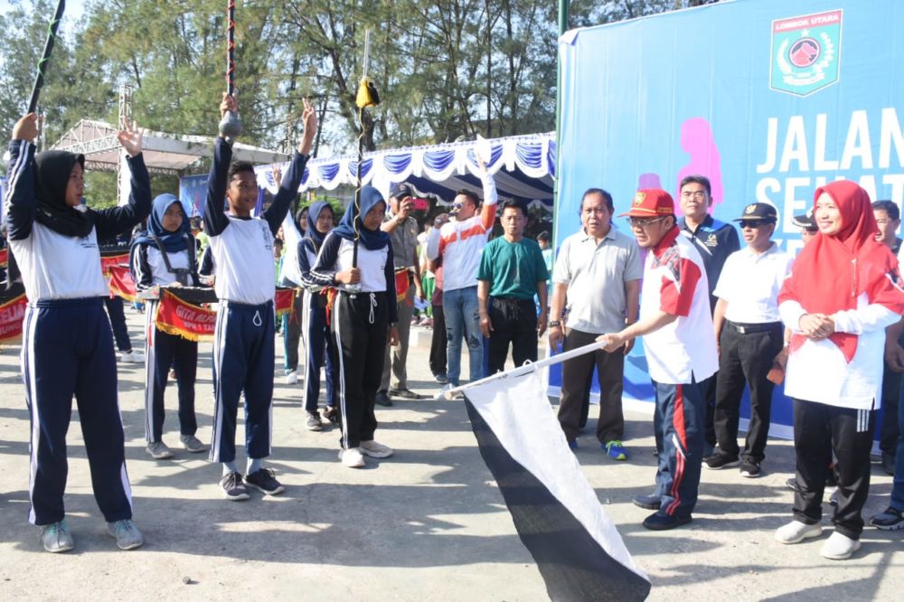 Bupati H. Najmul Akhyar mengangkat bendera tanda pelepasan jalan sehat keluarga yang digelar di lapangan Tioq Tata Tunaq Tanjung, Jumat (20/12/2019) (Foto; den/humaspro)