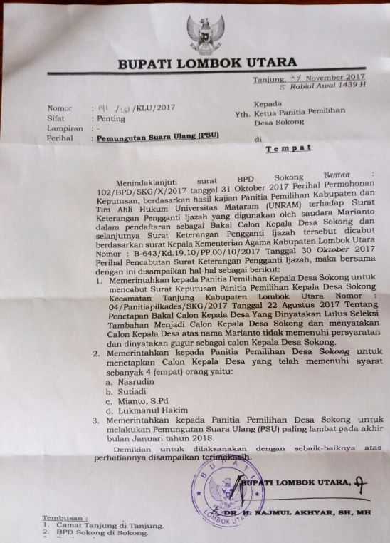 Keputusan itu tertuang dalam Surat Keputusan Bupati Nomor : 141/253/KLU/2017 yang ditujukan kepada Panitia Seleksi Pilkades Sokong. Dalam surat ter tanggal 24 November 2017 itu, setidaknya terdapat 3 poin keputusan Bupati.