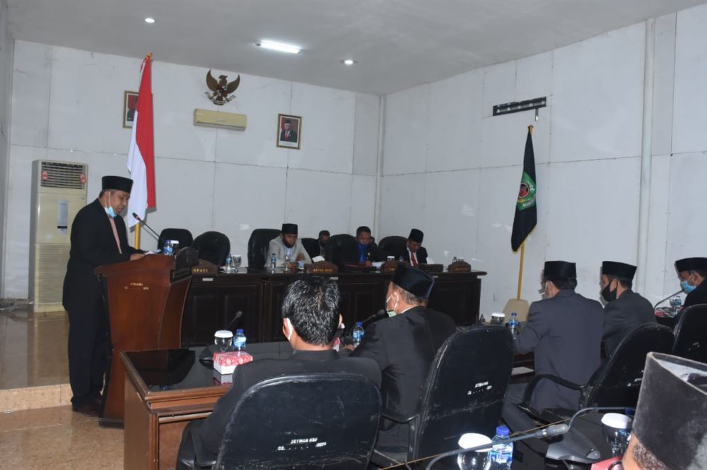 Plt. Bupati Lombok Utara H. Sarifudin, SH, MH menyampaikan nota keuangan Rancangan Perubahan APBD tahun 2020 dalam Sidang Paripurna Penjelasan Kepala Daerah terhadap RAPBD Perubahan Tahun 2020, di Aula DPRD, Senin (28/09/20).