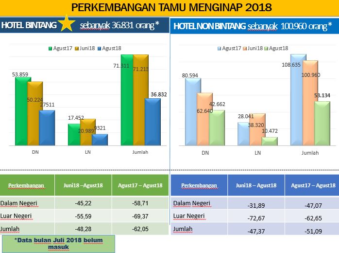 Badan Pusat statistik (BPS) NTB merilis TPK hotel bintang pada bulan Agustus 2018 yang mengalami penurunan dibandingkan bulan Juni 2018.