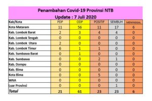 Siaran pers hari Selasa (07/07/20), Ketua Pelaksana Harian Gugus Tugas Provinsi Nusa Tenggara Barat, Drs. HL Gita Ariadi, M.Si menjelaskan, telah diperiksa sebanyak 215 sampel dengan hasil 171 sampel negatif, 21 sampel positif ulangan, dan 23 sampel kasus baru positif Covid-19, pasien sembuh 23 orang, kasus kematian 6 (enam) orang.